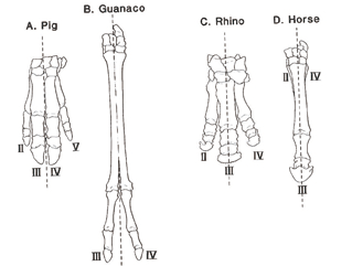 △偶蹄(A.猪、B.原驼)和奇蹄(C.犀牛、D.马)类动物脚的重点暗示图(MacFadden,1992) 宏构推介----中国科学院古脊椎动物与古东谈主类商榷所