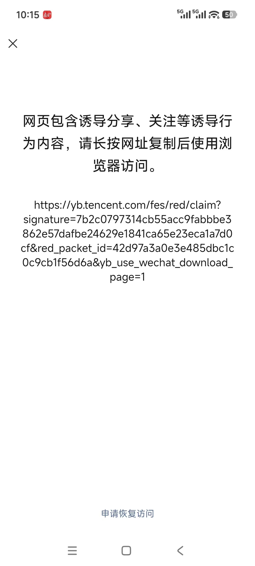 2月4日有效户发现,腾讯元宝的红包一语气已无法在微信内顺利掀开。只可复制一语气到浏览器才可掀开不息领取红包。元宝红包行动在上线4天后遭到微信封杀。